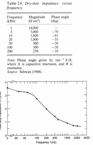 For the science nerds, see the chart below. For everyone else, skip to the next paragraph. The total human body impedance lowers as frequencies rise (Schwann 1968). For example at 60 Hertz the impedance is 3,000 Ohms and gradually declines to 500 Ohms at 1.7 kilo Hertz. (Reilly)